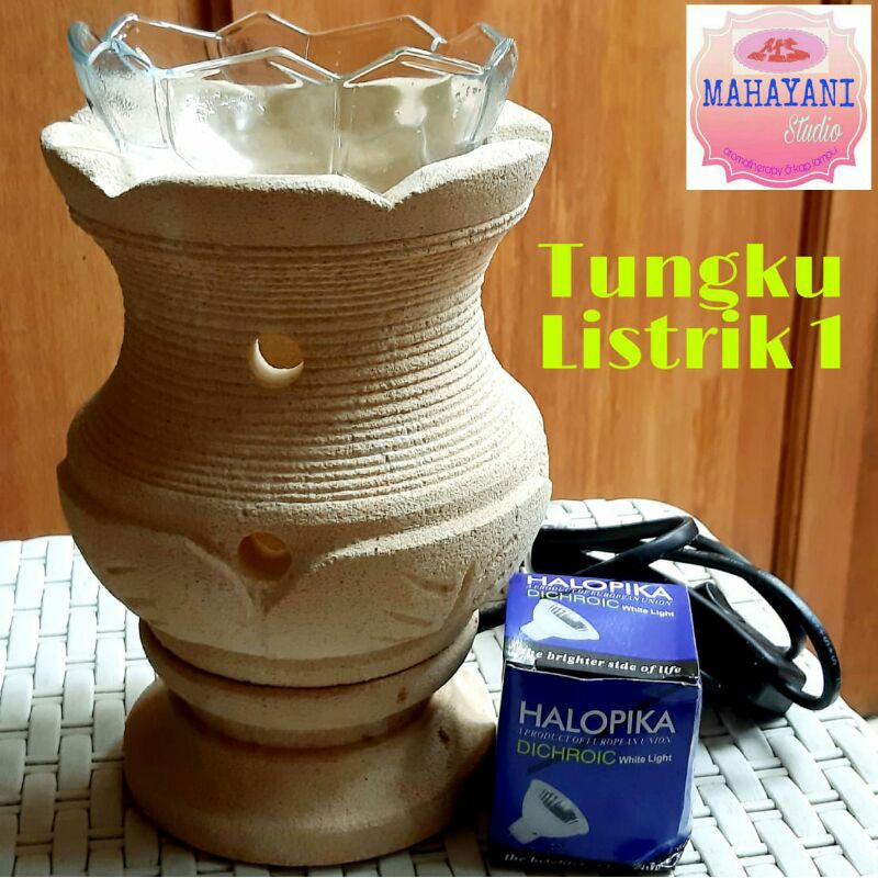 Tungku Aromaterapi Elektrik ; berbahan batu paras dipahat. Berat 1,8 kg. Ukuran : Diameter 13cm x Tinggi total dengan mangkuk 18cm. Menggunakan listrik sebagai pemanasnya dengan lampu halogen 50watt. Mangkuk dari kaca. Colokan listrik stop dan kontak. Kondisi lengkap.